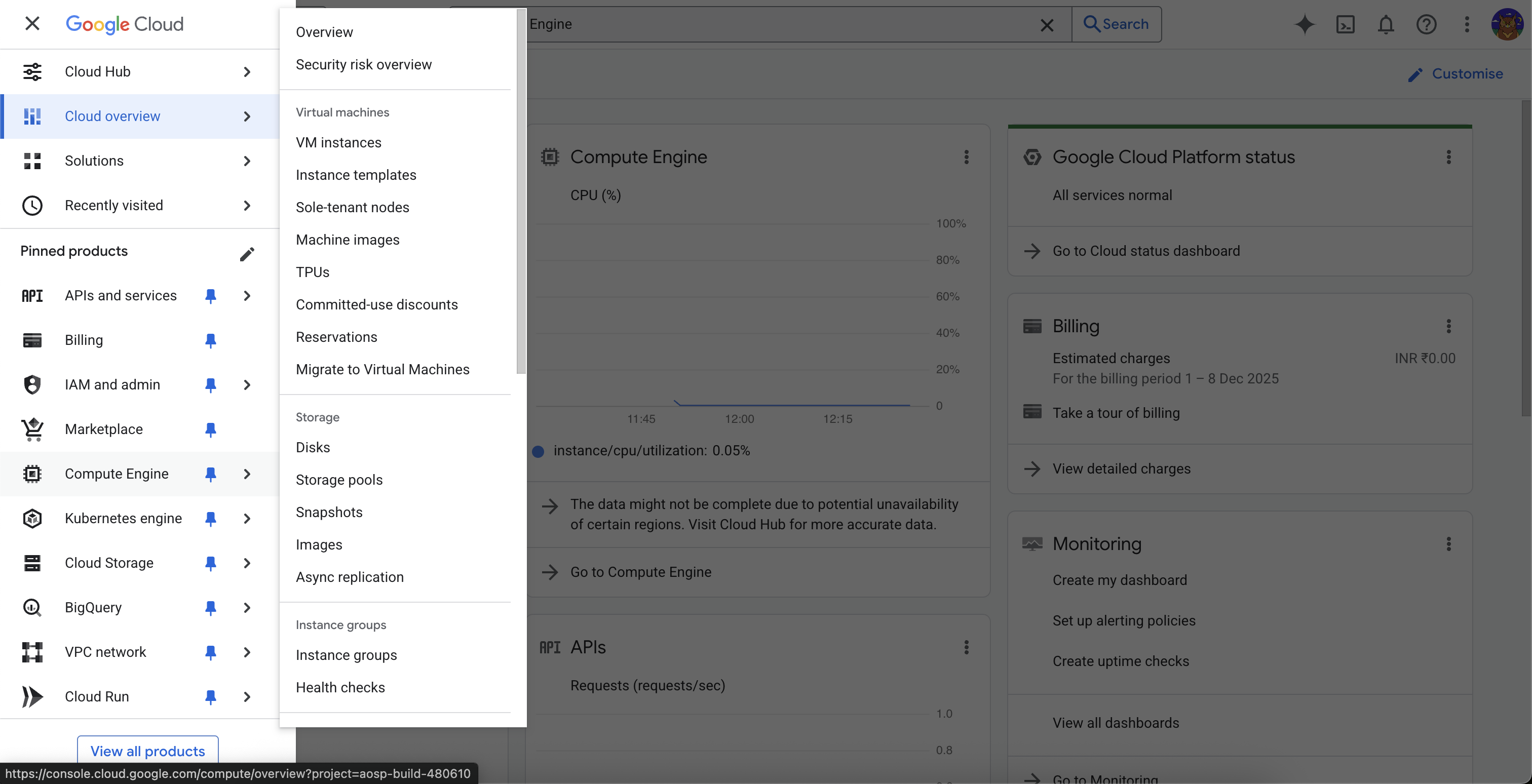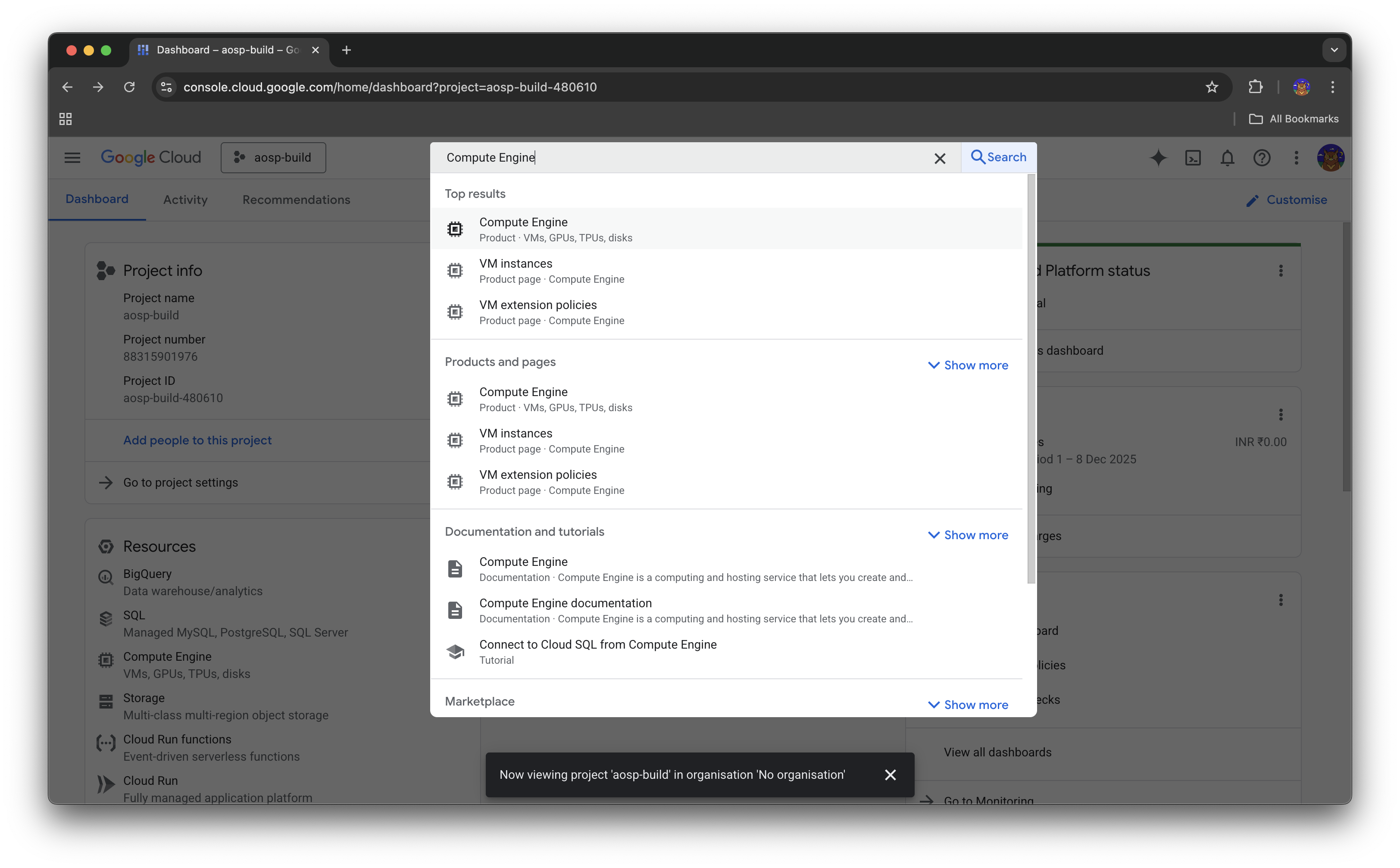 Next we need to enable the “Compute Engine API”. For this in the search bar type in “Compute Engine”. We see the overview page for compute engine for the aosp-build.
