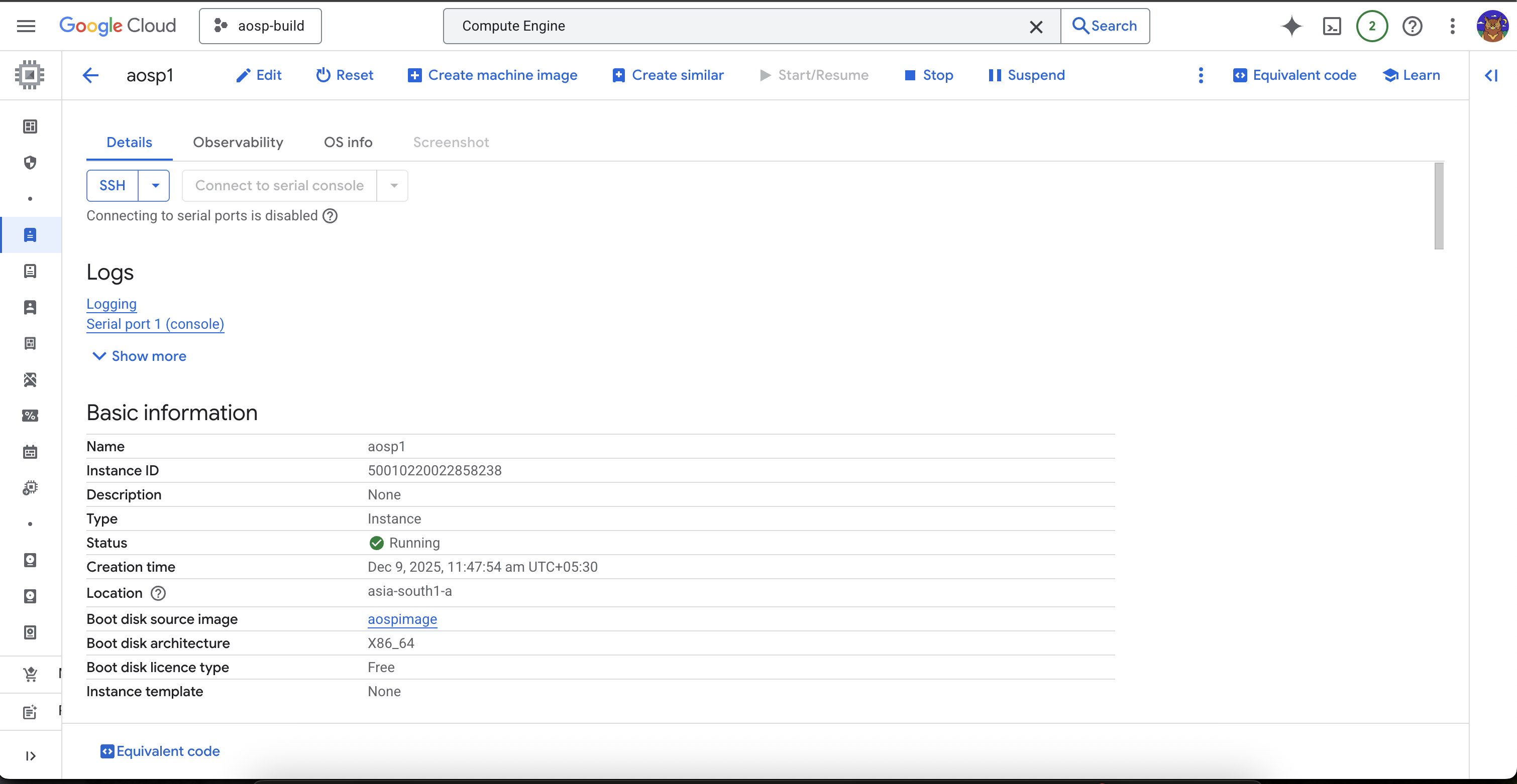 Created [https://www.googleapis.com/compute/v1/projects/aosp-build-480610/zones/asia-south1-a/disks/aospdisk].