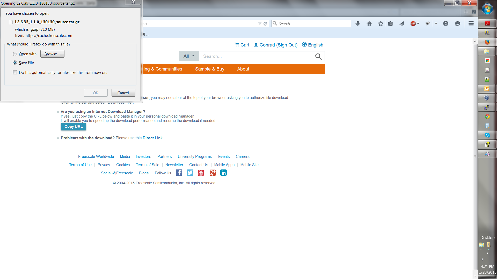 If all goes according to plan then you should see a download of the package L2.6.35_1.1.0_130130_source.tar.gz which you can save to your linux development environment. In my case it is an Ubuntu virtual machine running on my Windows laptop. The package download will take some time based on your network bandwidth and speed. The size of the package is roughly about 710MB.